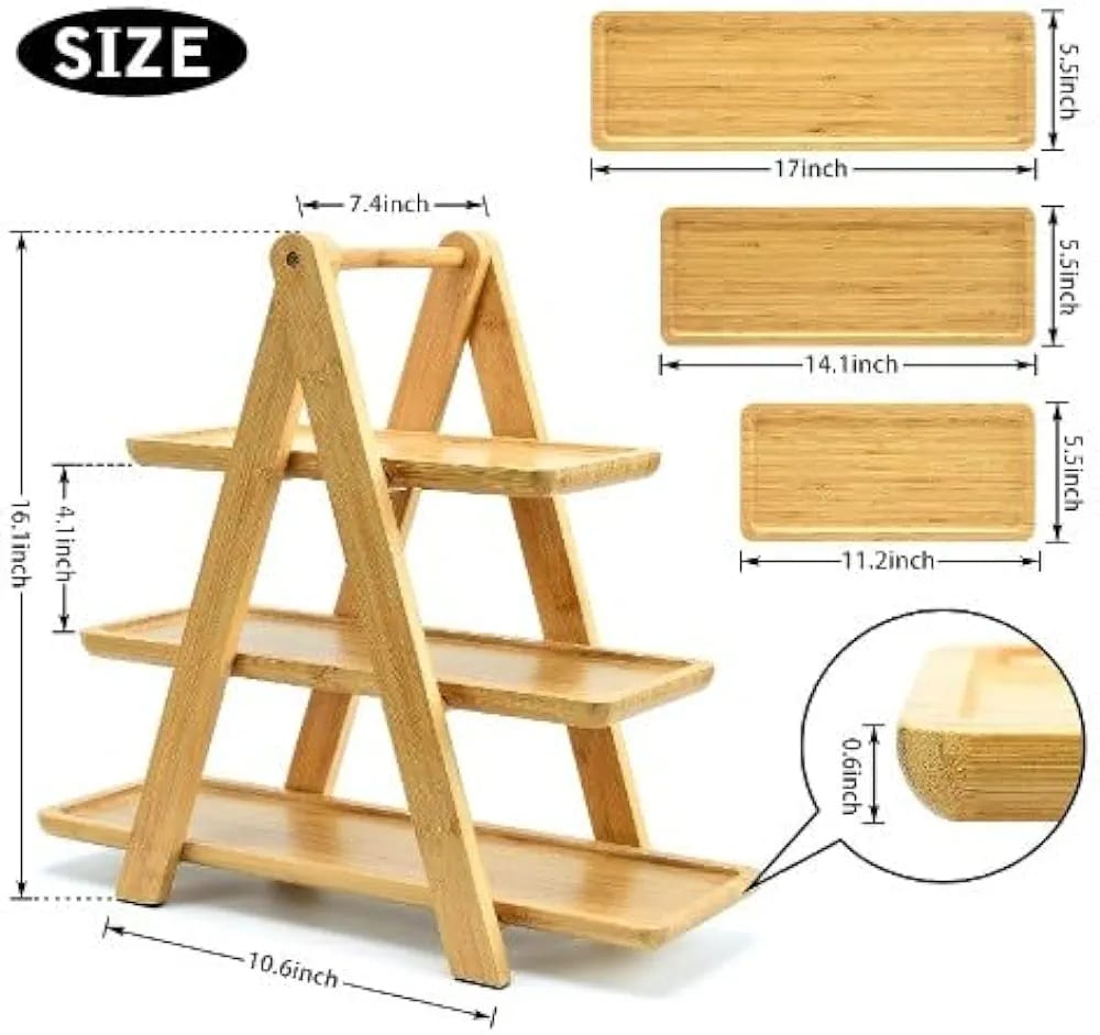 3 tier serving tray is very suitable for displaying cakes, snacks, fruits, appetizers, sushi and desserts. Wooden tray saves table space, keeps serving organized and easy to access for guests.