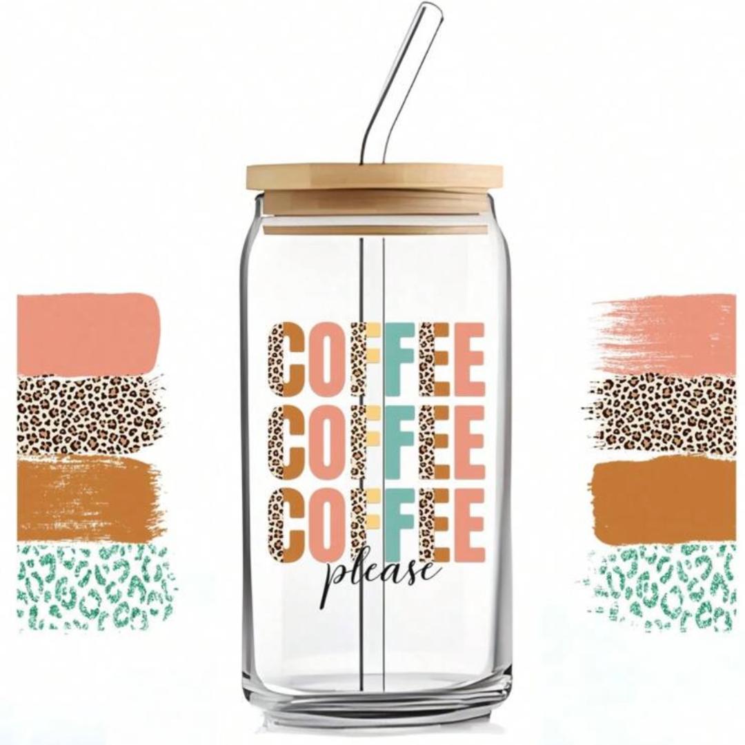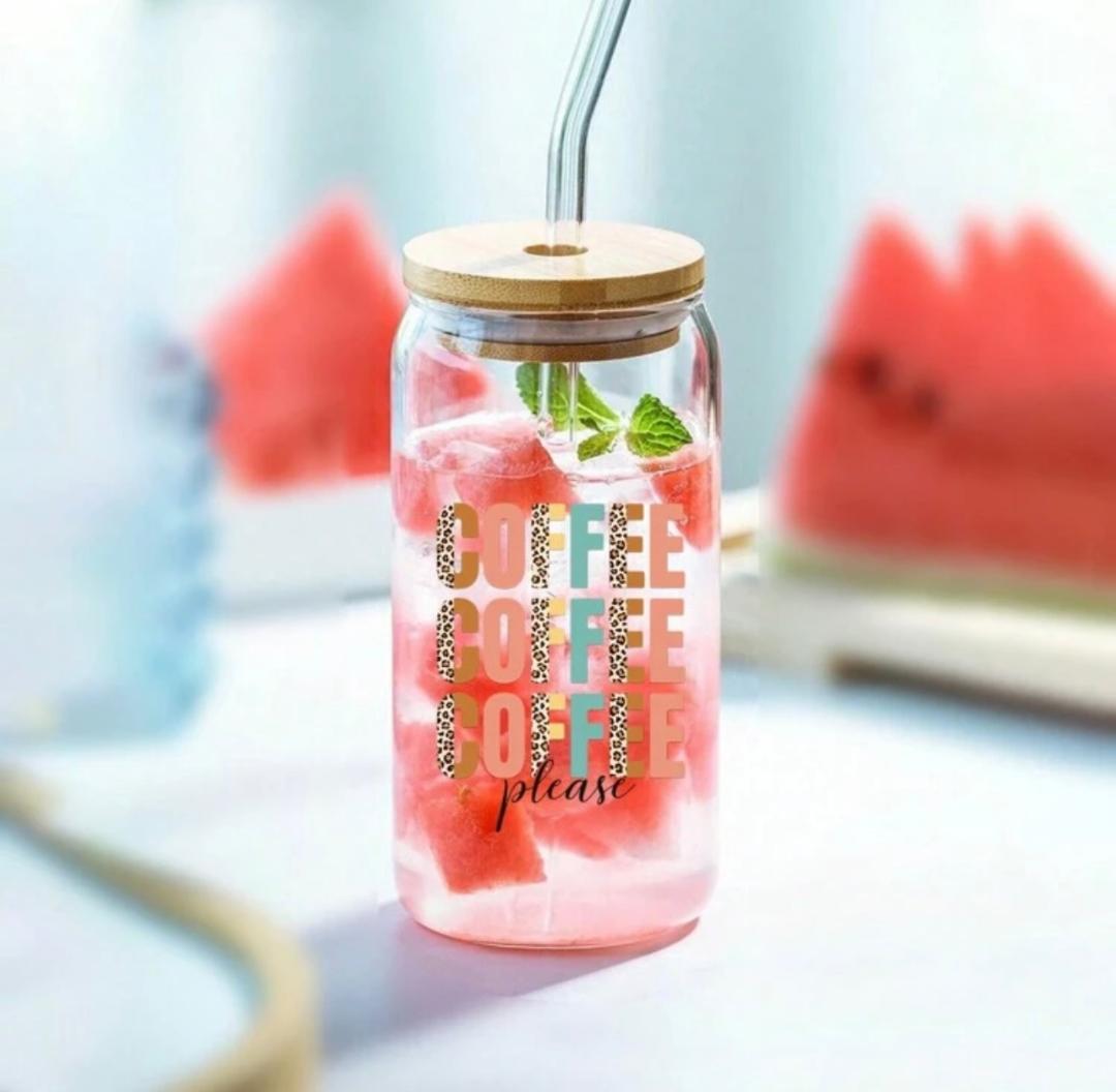 Coffee Design on a 480ml glass cup can with bamboo lid and straw