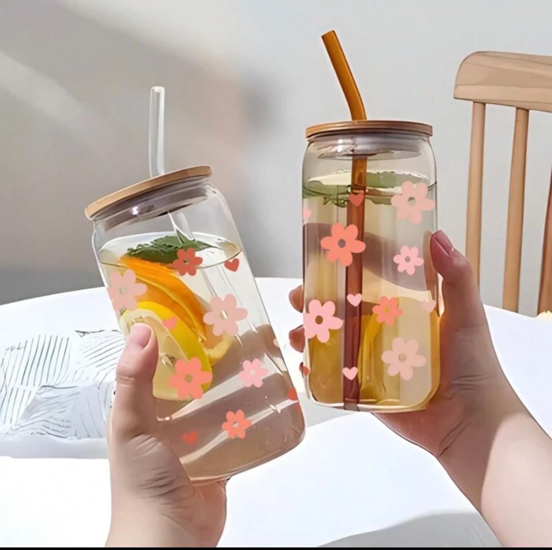 Flower Design on a 480ml glass cup can with bamboo lid and straw