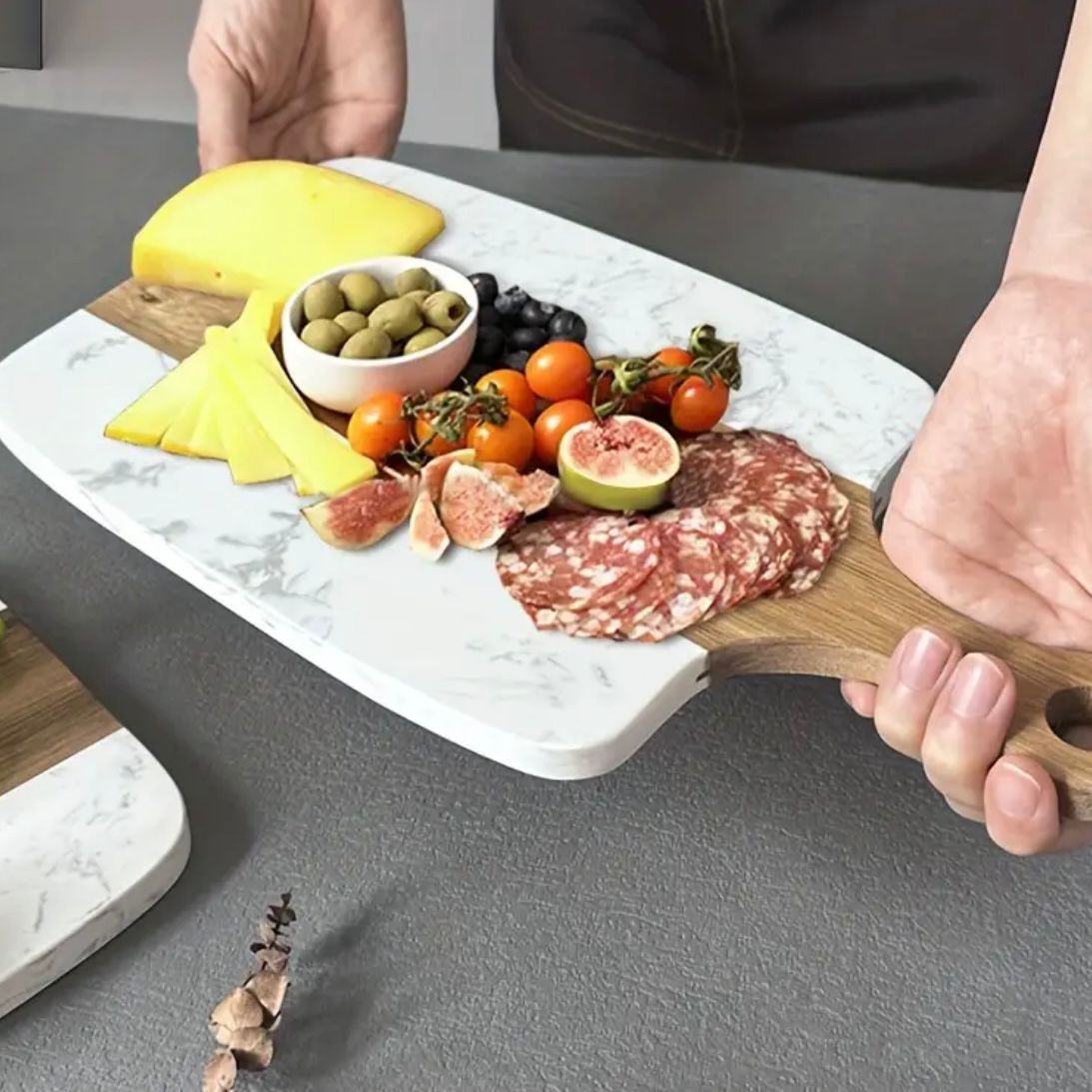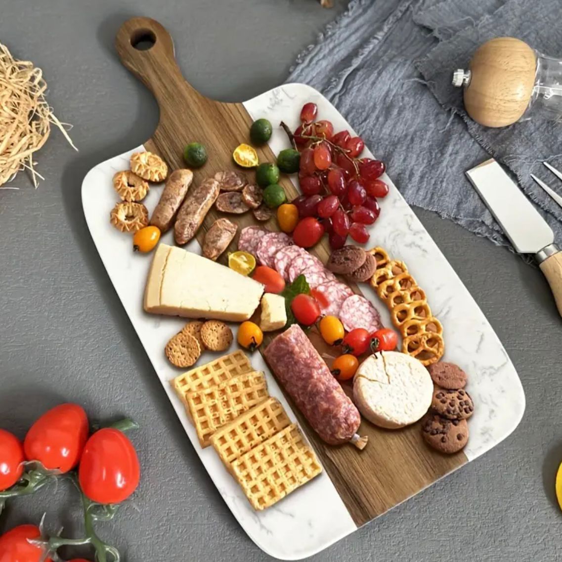 Use this charcuterie board for entertaining and serving food from meat, sushi, fruits, cheese to pastry and bread.