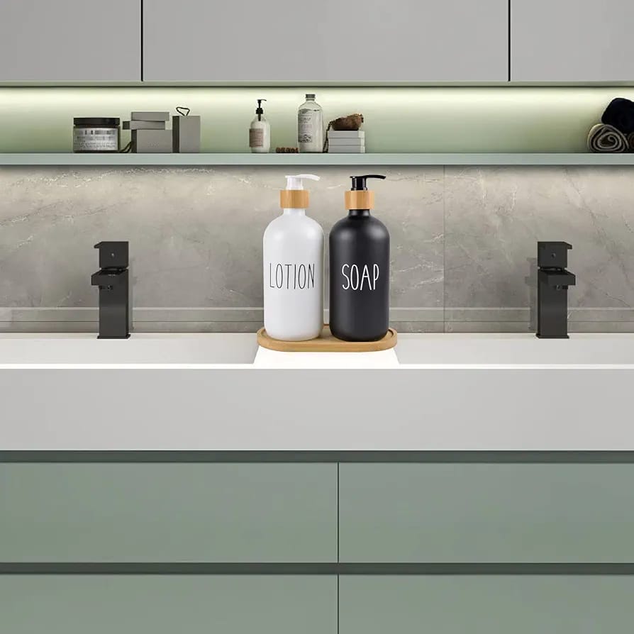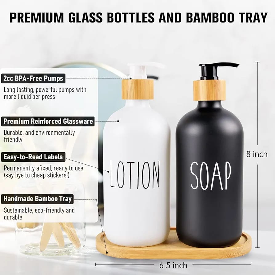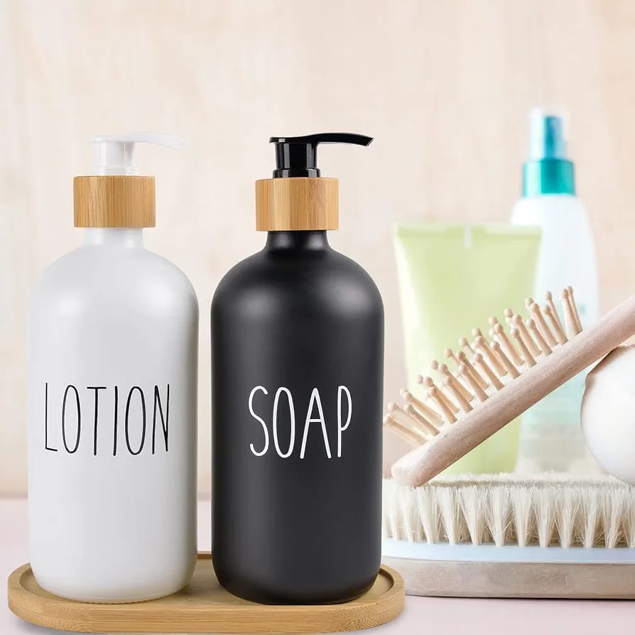 *Set Of 2 Glass Bottles (16oz) With 1 Tray, 2 Wooden Rings And Pump Head, Lotion Dispenser In Black & White, Soap Dispenser And Shampoo Bottle With Wooden Cover